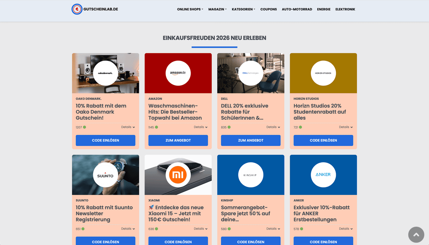 GutscheinLab là sự kết hợp hoàn hảo giữa công nghệ quản trị dữ liệu và tư duy tối ưu hóa trải nghiệm mua sắm. Chúng tôi đã xây dựng một nền tảng coupon chuyên nghiệp, tinh tế trong thiết kế và mạnh mẽ trong vận hành, giúp kết nối người tiêu dùng với những giá trị ưu đãi tốt nhất một cách nhanh chóng và hiệu quả.